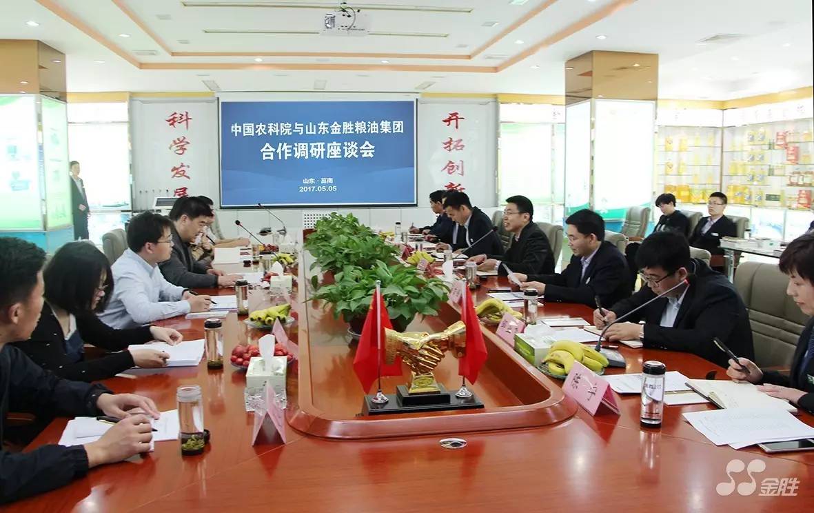 ? ? 2017年5月5日上午,中國農科院農產品加工研究所與山東金勝糧油集團合作調研座談會在金勝集團隆重召開。中國農科院農產品加工研究所副所長、研究員王強帶領專家團隊骨干成員一行到金勝集團考察洽談合作。金勝集團總經理高冠勇、副總經理宋立里、副總經理崔言峰、副總經理武玉波等企業高管、骨干成員接待并參加本次座談會。