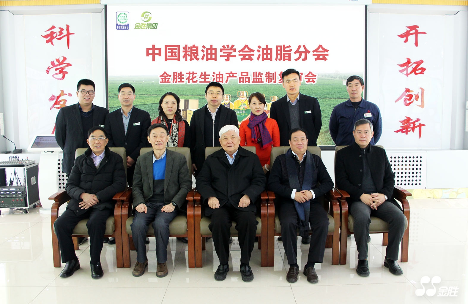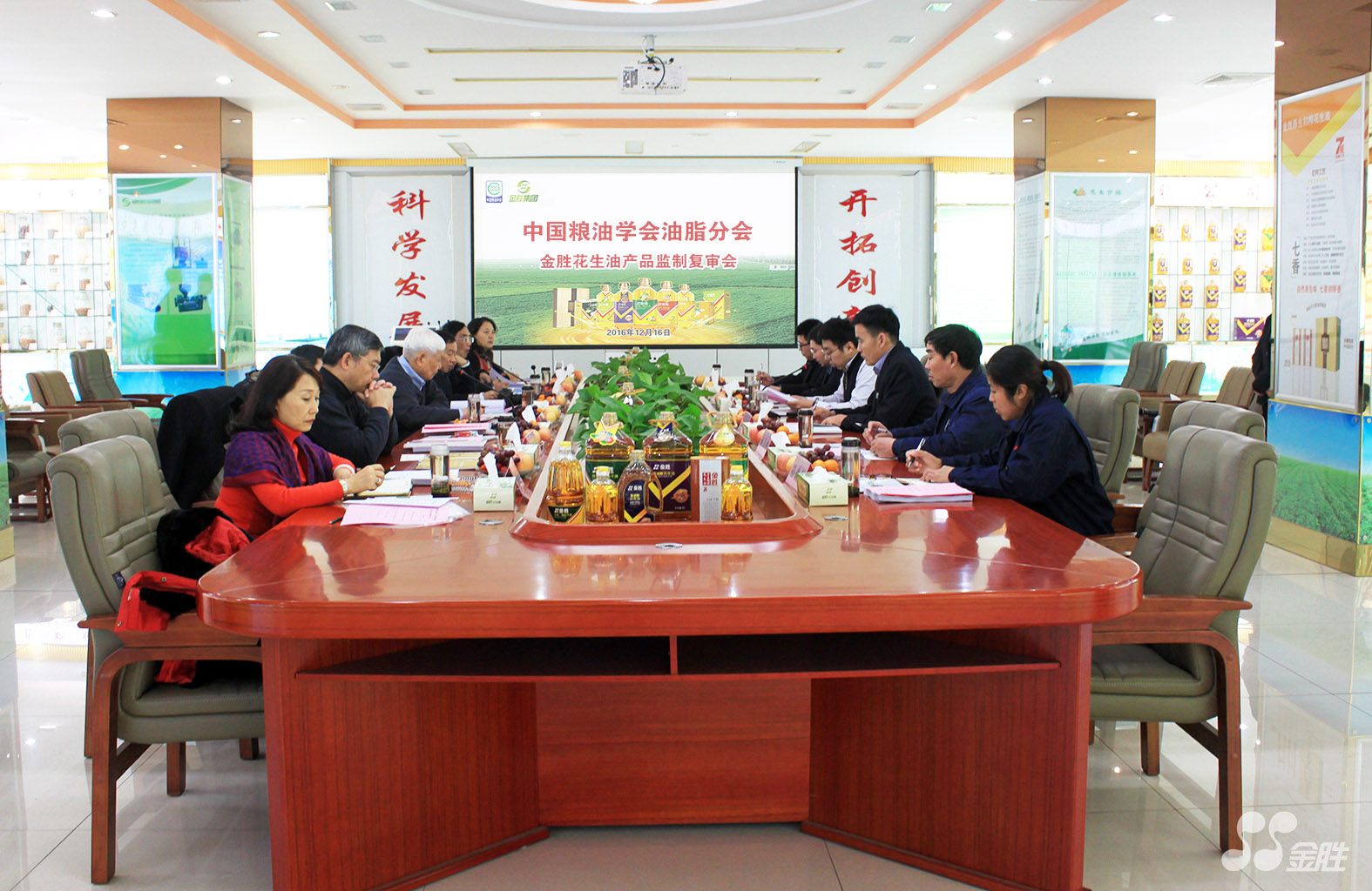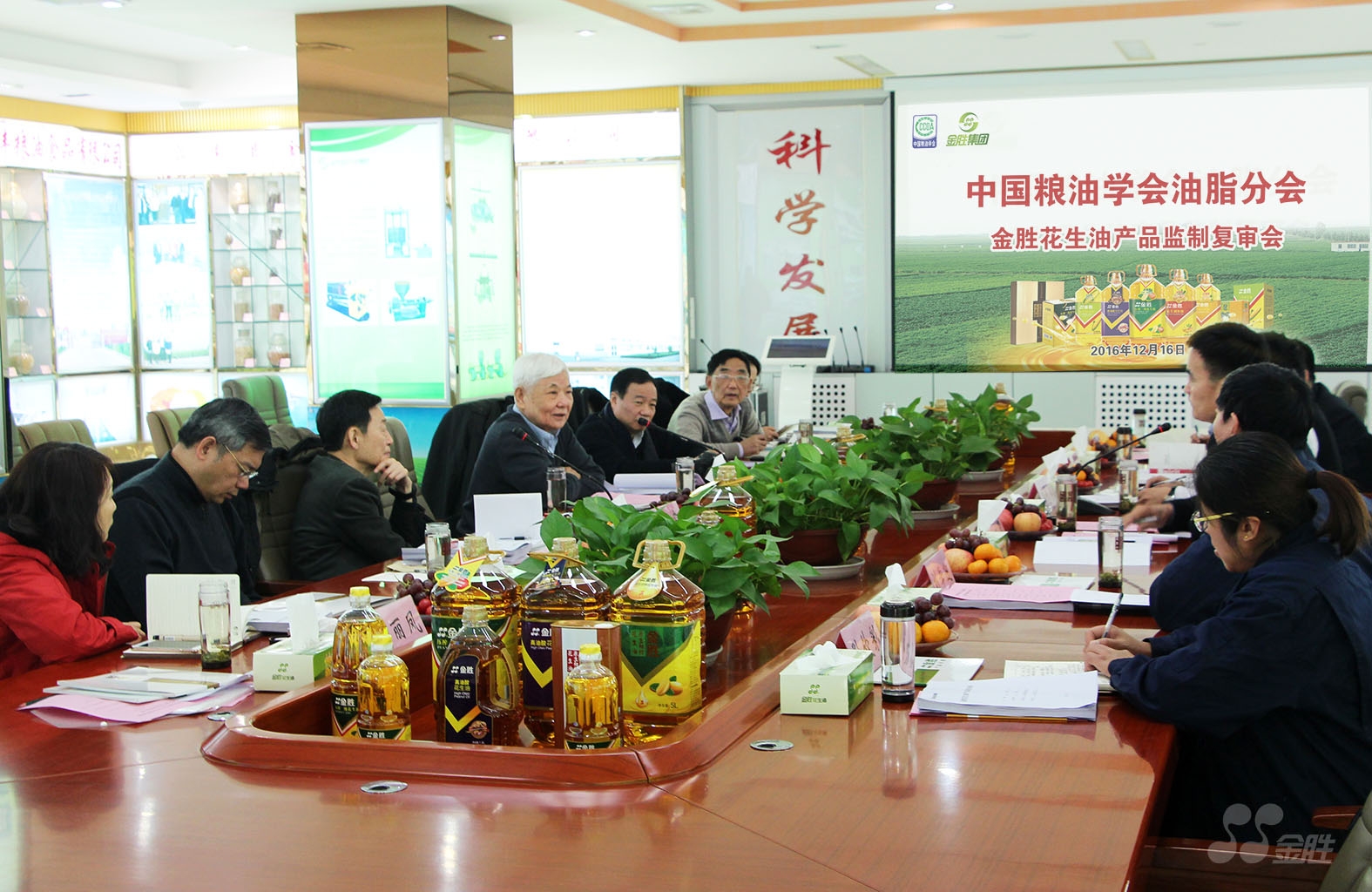 ? ? 2016年12月16日,由中國糧油學會油脂分會會長王瑞元,副理事長胡承淼,執行會長、武漢輕工大學何東平教授,常務副會長、江南大學王興國教授,專家組組長傅敦智,副秘書長、河南工業大學劉玉蘭教授,副秘書長周麗鳳等國內多位行業內頂級專家組成審核小組,在金勝集團研發中心會議室召開了“金勝花生油——中國糧油學會油脂分會2016年度產品監制復審會”。