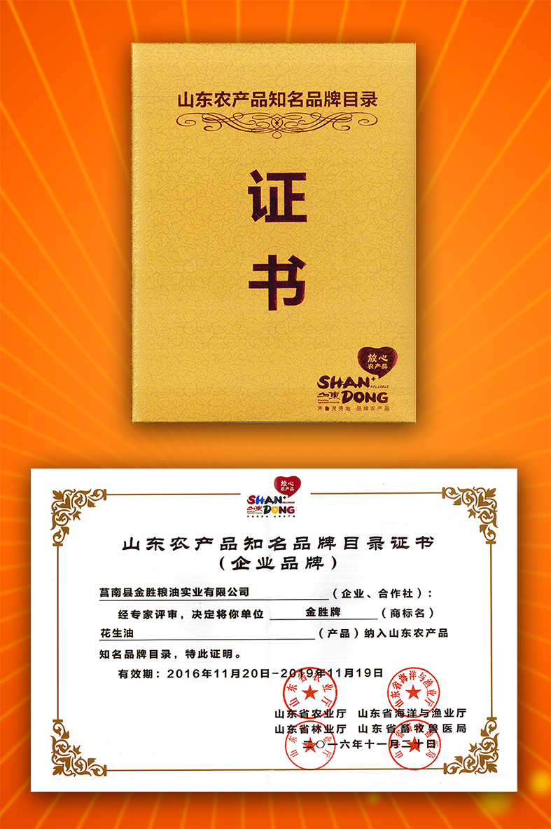 ? ? 近日,由省農業廳、省海洋與漁業廳、省林業廳、省畜牧獸醫局聯合評選公布了山東省首批知名農產品企業產品品牌,金勝花生油榮登榜單第九位。