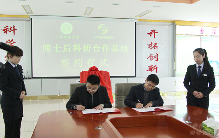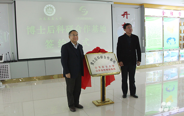 在熱烈友好的氣氛中,山東農業大學人事處副處長吳茂東與金勝集團董事長兼總經理高冠勇共同簽署了《山東農業大學與山東金勝糧油集團博士后科研工作站合作協議書》。最后,山東農業大學副校長、教授王振林和縣委副書記張雷一同為聯合共建博士后科研合作基地進行了揭牌。