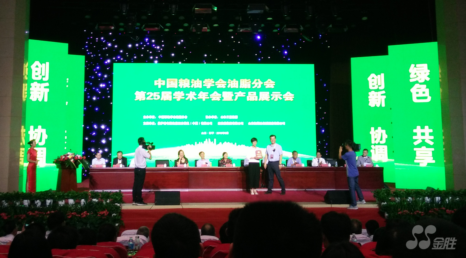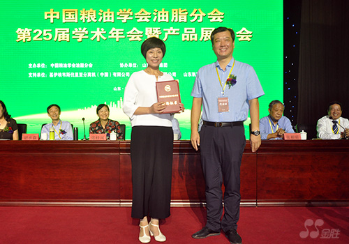 2016年9月26日-9月27日,中國糧油學會油脂分會主辦的“中國糧油學會油脂分會第二十五屆學術年會暨產品展示會”在山東鄒平順利召開。大會舉行了中國糧油學會科學技術獎頒獎儀式,金勝集團科研申報項目:《適溫壓榨香味花生油生產技術研究與應用》榮獲大會科學技術三等獎,研發中心主任陳寧代表金勝集團上臺領獎。