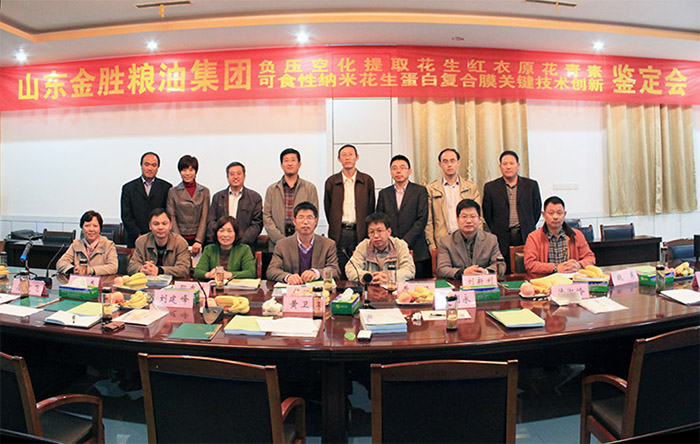 ? ?013年10月26日上午,由山東金勝糧油集團有限公司承擔的“負壓空化提取花生紅衣原花青素”和“可食性納米花生蛋白復合膜關鍵技術創新”兩個項目順利通過了省級鑒定。 ? ?本次科技成果鑒定會由山東省科技廳委托臨沂市科技局組織召開,鑒定委員會由中國海洋大學曹立民教授、山東農業大學侯漢學、刁恩杰教授、山東省農業科學院滕葳研究員,山東輕工業學院邵秀芝、劉新利教授、臨沂大學魏東教授等7位專家組成。市科技局及縣科技局領導及企業相關負責人等出席了鑒定會。
