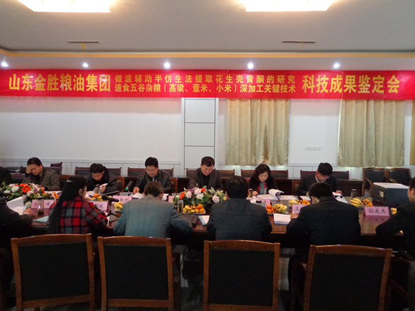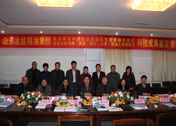 2012年12月29日,受山東省科技廳委托,臨沂市科技局組織相關專家對我公司和青島農業大學共同完成的“微波輔助半仿生法提取花生殼黃酮”和“速食五谷雜糧(高粱、薏米、小米)深加工關鍵技術”兩個項目進行了科技成果鑒定。與會的七位專家分別來自山東省農業科學院、中國海洋大學、山東農業大學、山東輕工業學院、日照職業學院。參加本次鑒定會的市縣領導有市科技局成果科科長付艷玫、市科技局成果科副科長黃衛平、縣科技局局長劉建峰、縣科技局副局長徐淑嶺和縣局唐寬飛、李曉云兩位科長。我公司總經理高冠勇、副總經理崔言峰、研發中心主任陳寧參加了鑒定會。青島農業大學副院長孫慶杰教授代表我公司對兩個項目進行了匯報,與會專家聽取了課題組的匯報,審查了相關資料,通過質詢、討論,分別形成如下鑒定意見: