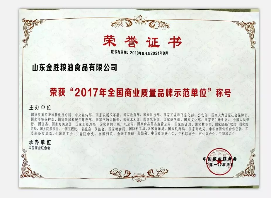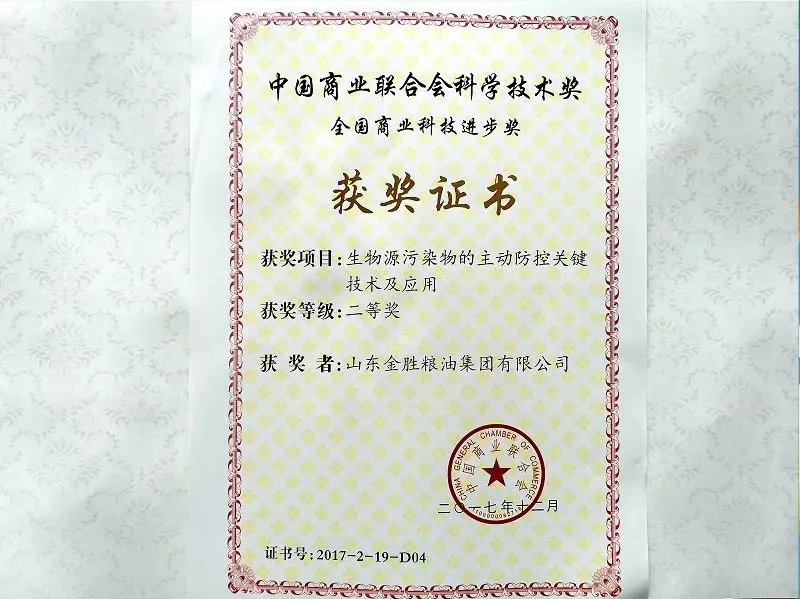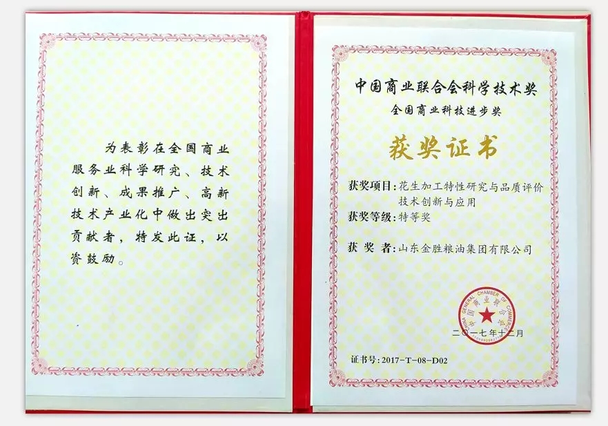 研發中心主任陳寧代表公司參會。金勝集團與中國農科學院聯合申報的“花生加工特性研究與品質評價技術創新與應用”獲得全國商業科技進步特等獎,與江南大學聯合申報的“生物源污染物的主動防控關鍵技術及應用”獲得全國商業科技進步二等獎,集團子公司山東金勝糧油食品有限公司榮獲“2017年全國商業質量品牌示范單位”。