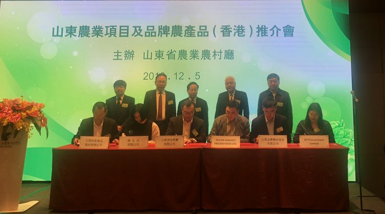 ? ? ? ? 12月4日-7日,“2018香港山東周”在美麗的香港拉開帷幕。12月5日,由山東省農業農村廳主辦的“山東農業項目及品牌農產品推介會”在香港金鐘太古廣場萬豪酒店隆重舉行,山東省農業農村廳廳長李希信、副廳長林國華、香港山東商會聯合總會會長王殿杰、香港食物環境衛生署處長先后致辭講話。金勝集團副總經理、山東金勝糧油食品公司總經理宋立里代表企業出席活動并簽約。