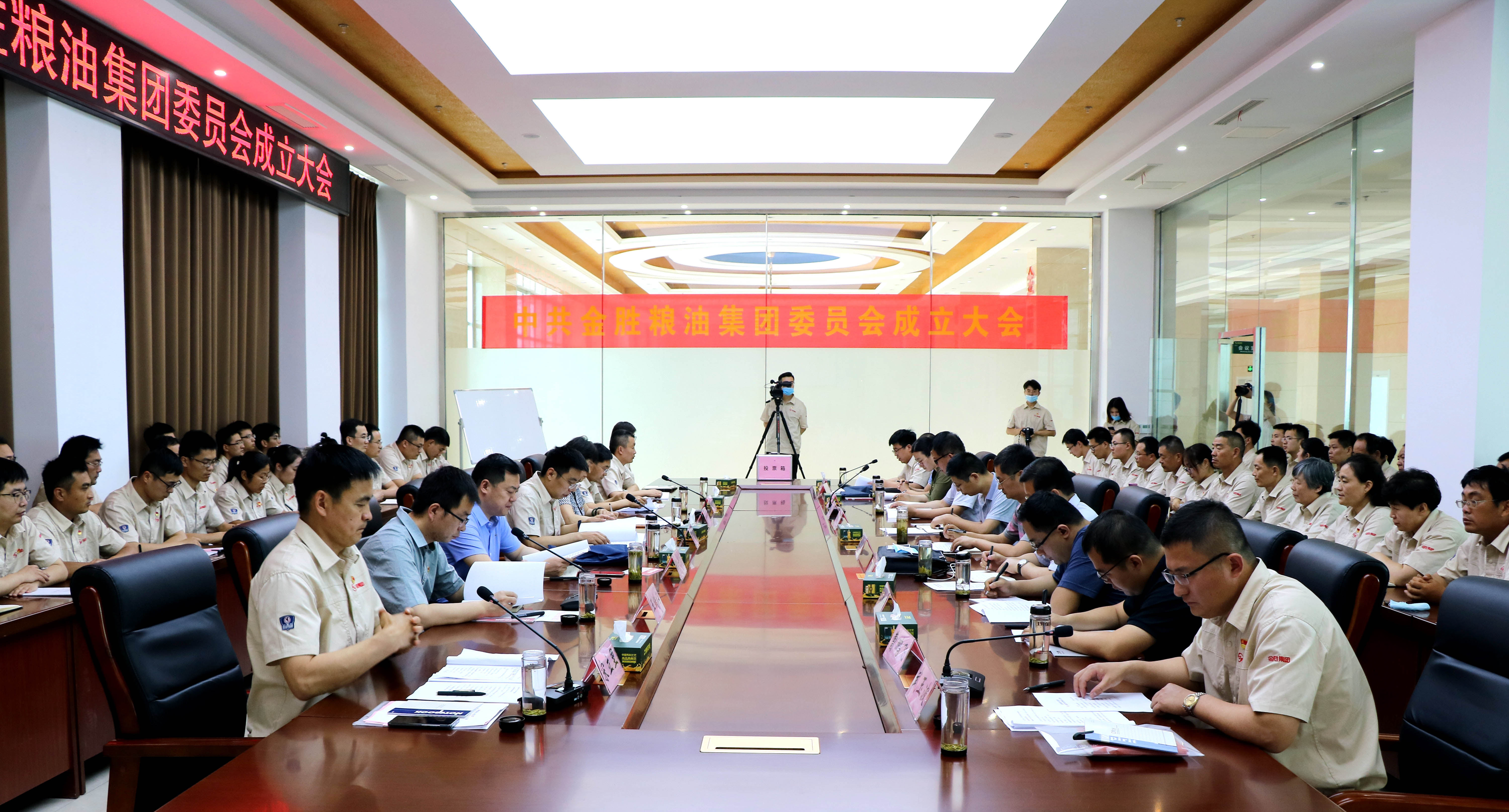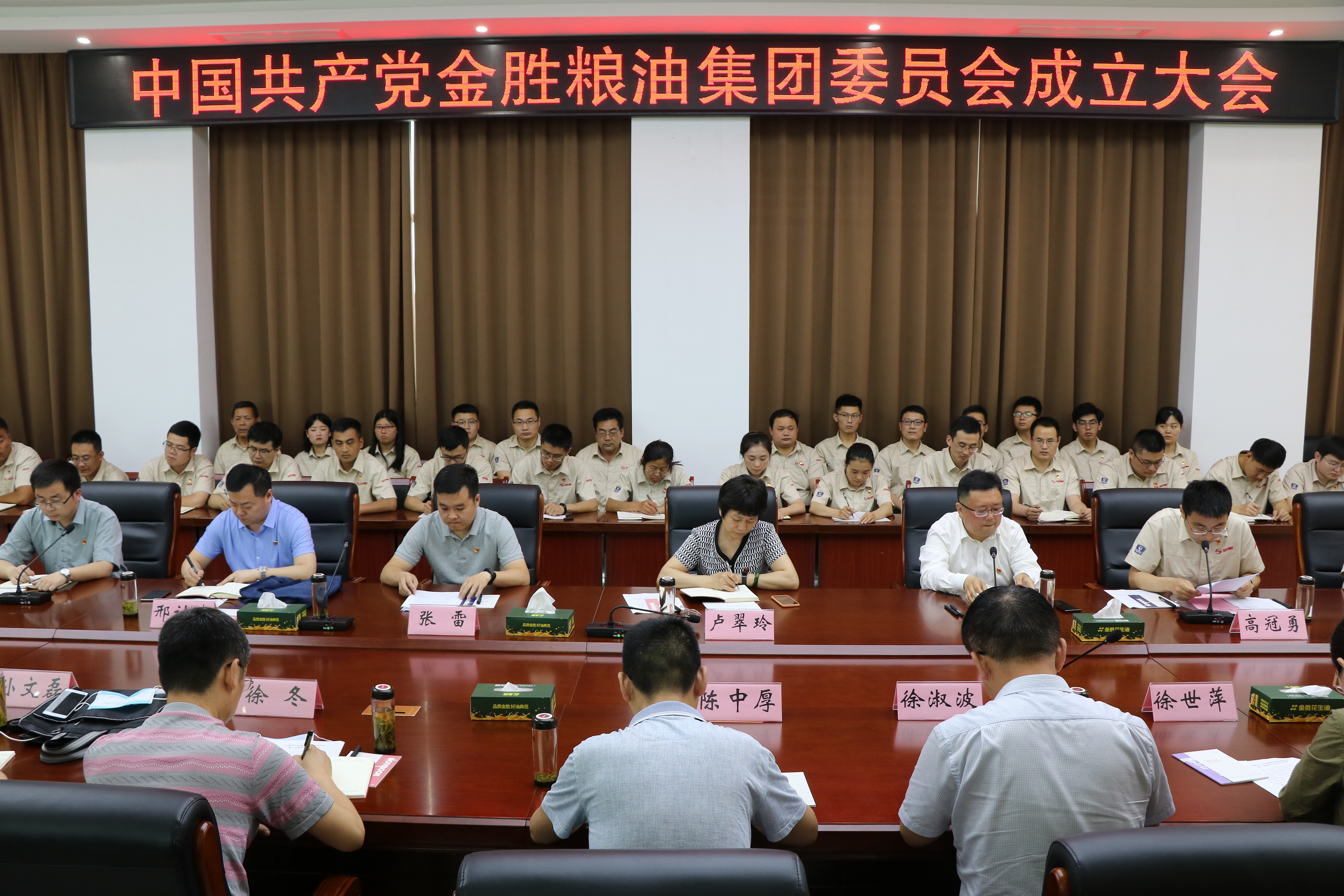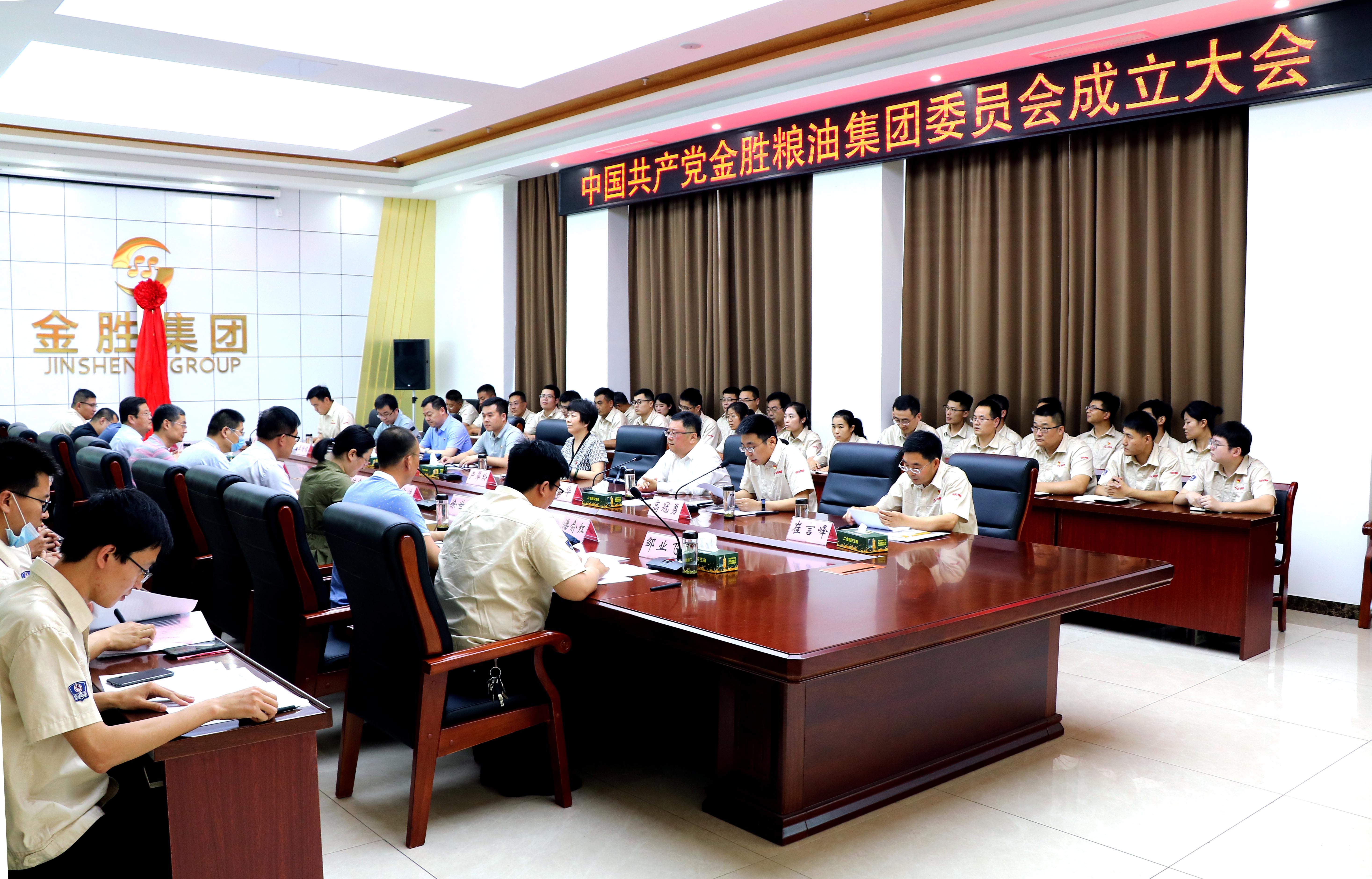 ? ?6月2日上午,金勝糧油集團黨委成立大會在金勝花生科技產業園電商大廈三樓會議室隆重召開。莒南縣委常委、組織部長張雷,市派莒南縣高質量發展服務隊隊長、市科學技術協會副主任盧翠玲,市派莒南縣高質量發展服務隊副隊長、市司法局副調研員邢計曉,十字路街道黨工委書記張華出席會議,集團董事長兼總經理高冠勇及全體黨員參加了金勝集團黨委成立大會。